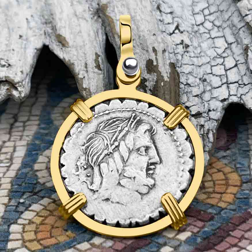 Roman Republic Silver Denarius Serratus 82 BC Jupiter & Victory 14K Gold Pendant | Artifact #3276 is backordered and will ship as soon as it is back in stock.