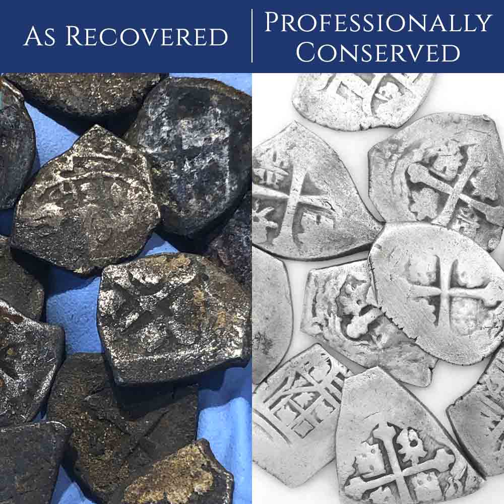 Crudely minted cob coins - short for cabo de barra, or "end of the bar," each has its own unique shape - and combined with the sea wear and stunning patinas, each is a small work of art. And the coins in this special collection were recovered during the heyday of the 1715 Fleet recovery efforts, when legends like Kip Wagner and Mel Fisher headed crews destined to discover these precious treasures!