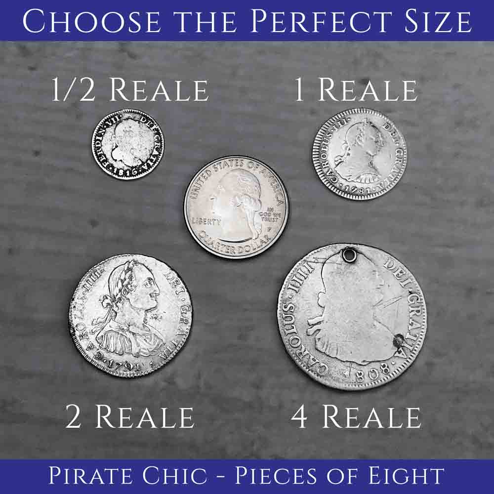 Sometimes called “America’s First Silver Dollar” because they were in daily use, and were legal tender in the United States, until 1857... right before the U.S. Civil War. Pieces of 8 - both the large 8 Reales, and the smaller denominations of 4, 2, 1, and 1/2 - were minted by the mighty Spanish empire from New World silver – and traded (and pirated) the world over. These silver coins are the famous coins of pirate legend and lore!
