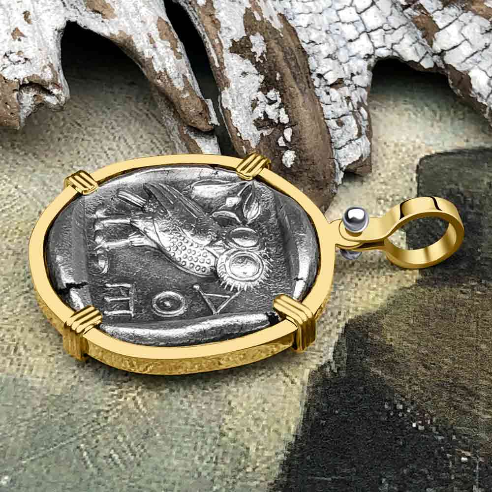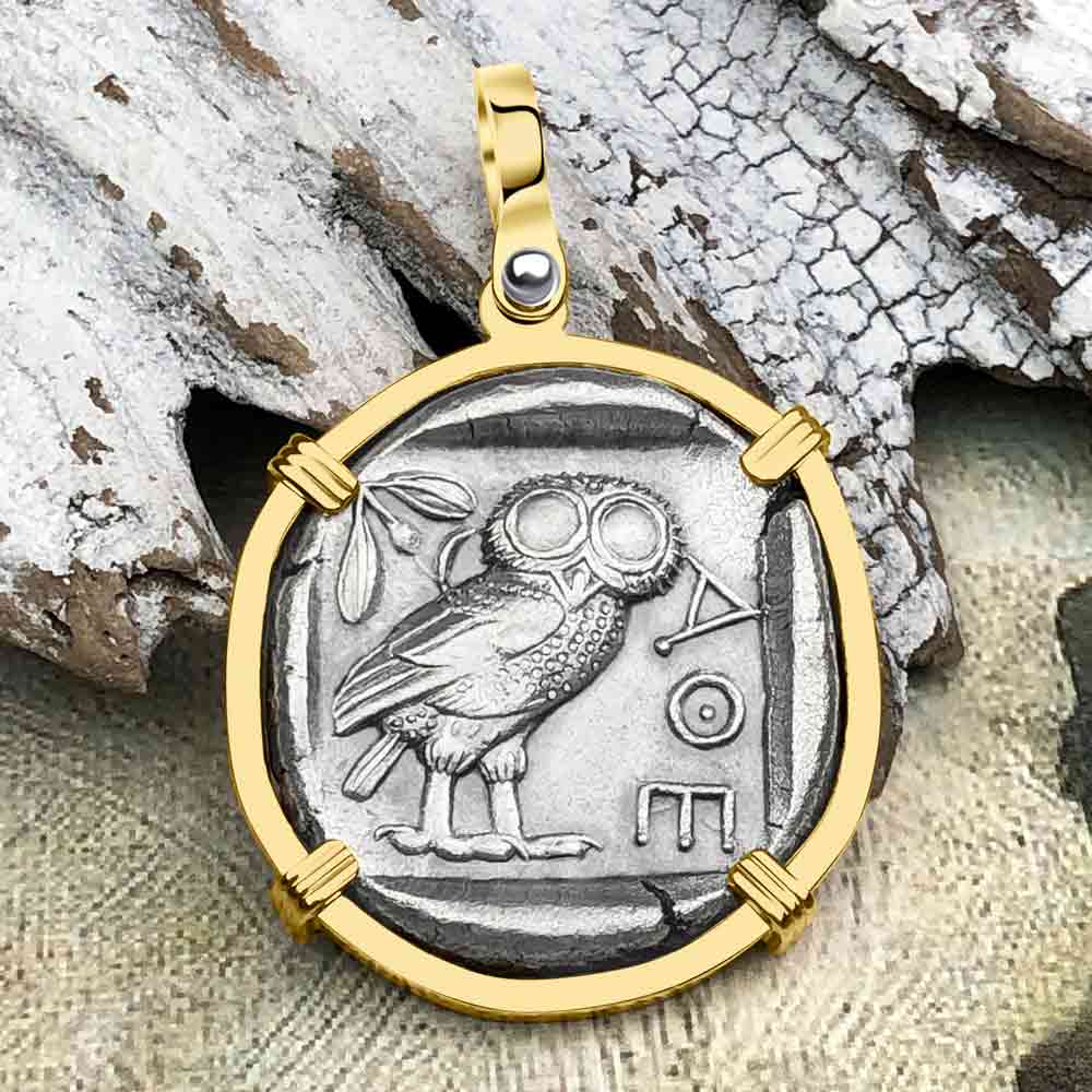 Ancient Greek Athena and the Owl Silver Tetradrachm circa 450 BC 14K Gold Pendant | Artifact #5758 is backordered and will ship as soon as it is back in stock.