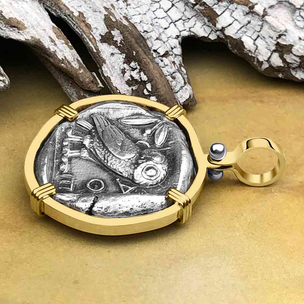 Ancient Greek Athena and the Owl Silver Tetradrachm circa 450 BC 14K Gold Pendant | Artifact #5788 is backordered and will ship as soon as it is back in stock.