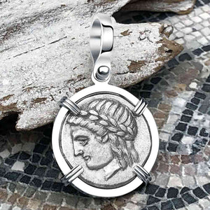Ancient Greek Lion & Apollo Miletos Silver Drachm 350 BC 14K White Gold Pendant | Artifact #3838 is backordered and will ship as soon as it is back in stock.