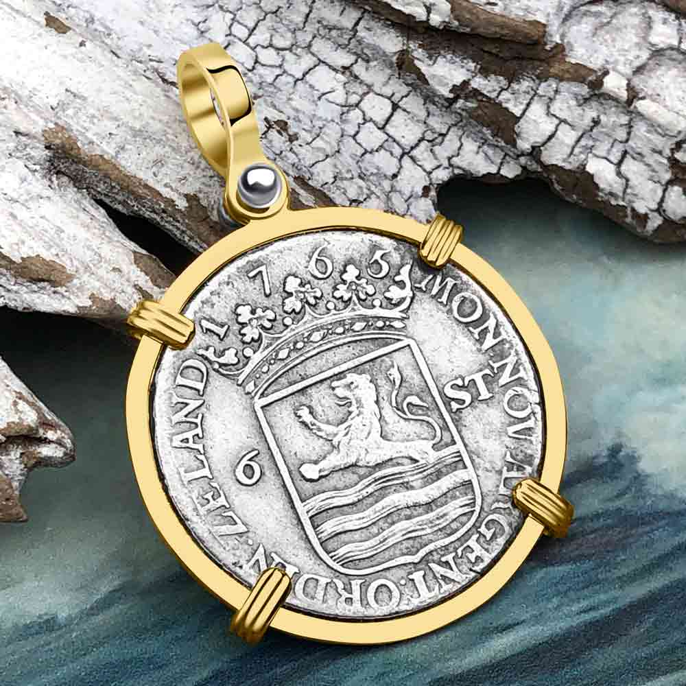 Dutch East India Company 1765 Silver 6 Stuiver Ship Shilling "I Struggle and Survive" 14K Gold Pendant | Artifact #5932 is backordered and will ship as soon as it is back in stock.
