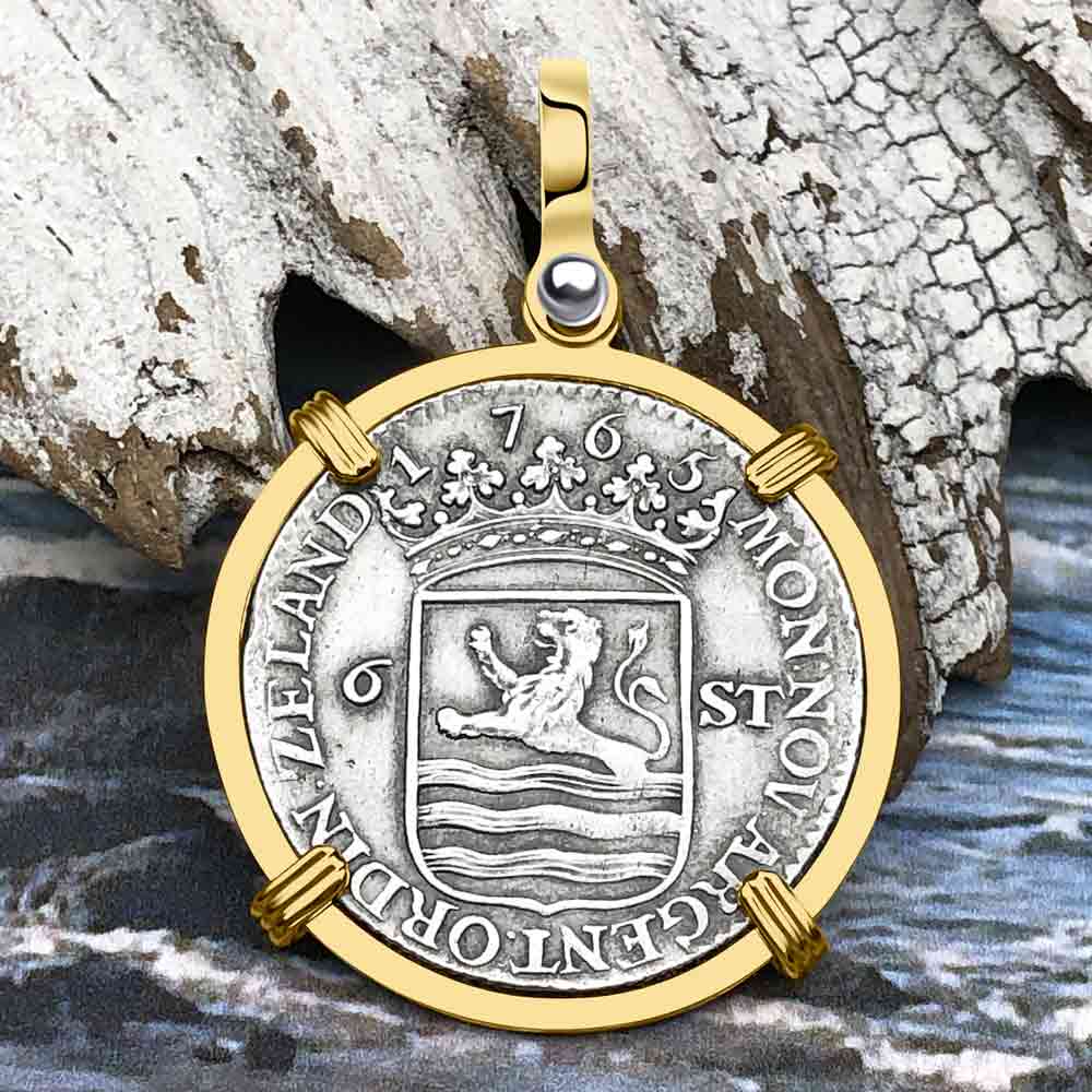 Dutch East India Company 1765 Silver 6 Stuiver Ship Shilling "I Struggle and Survive" 14K Gold Pendant | Artifact #5934 is backordered and will ship as soon as it is back in stock.