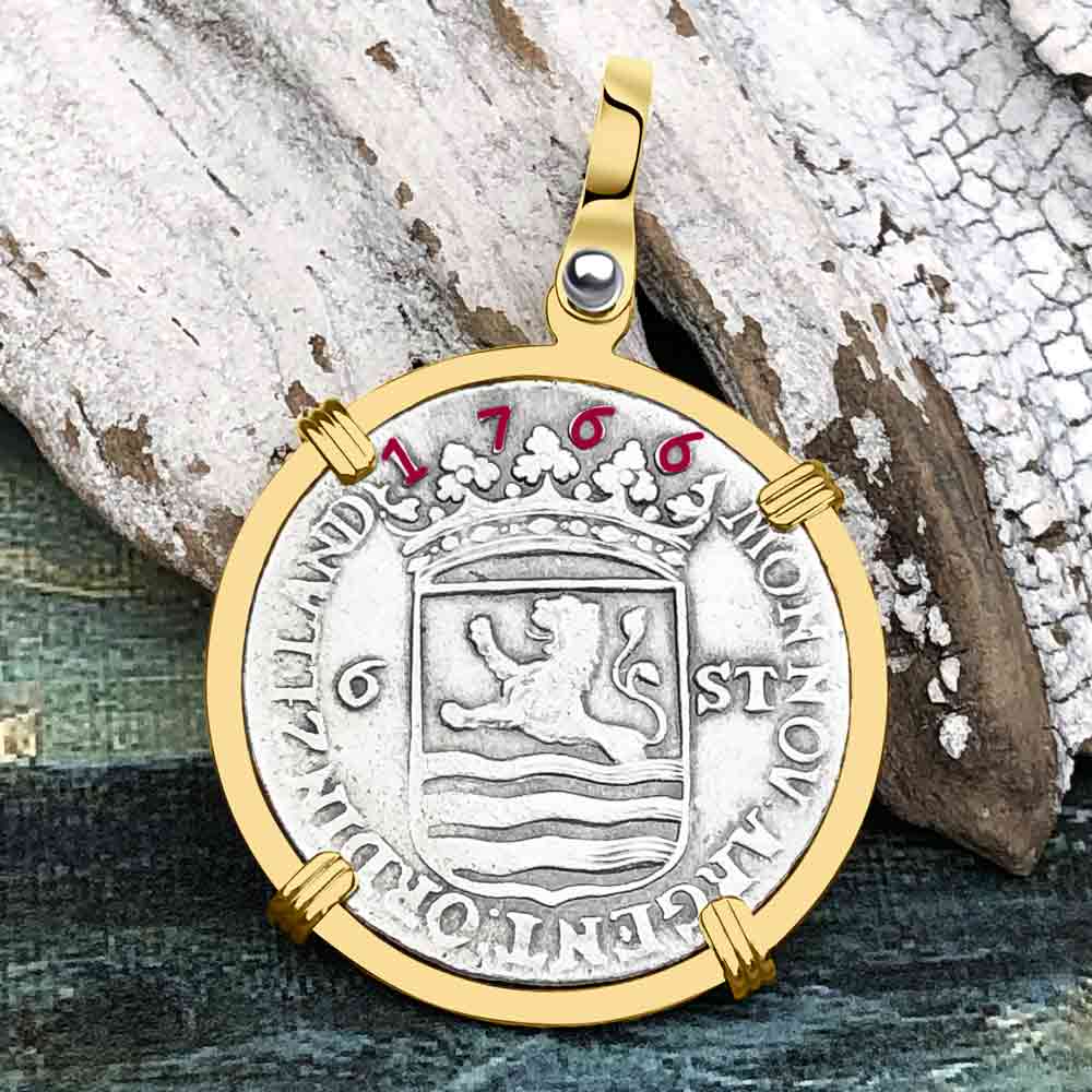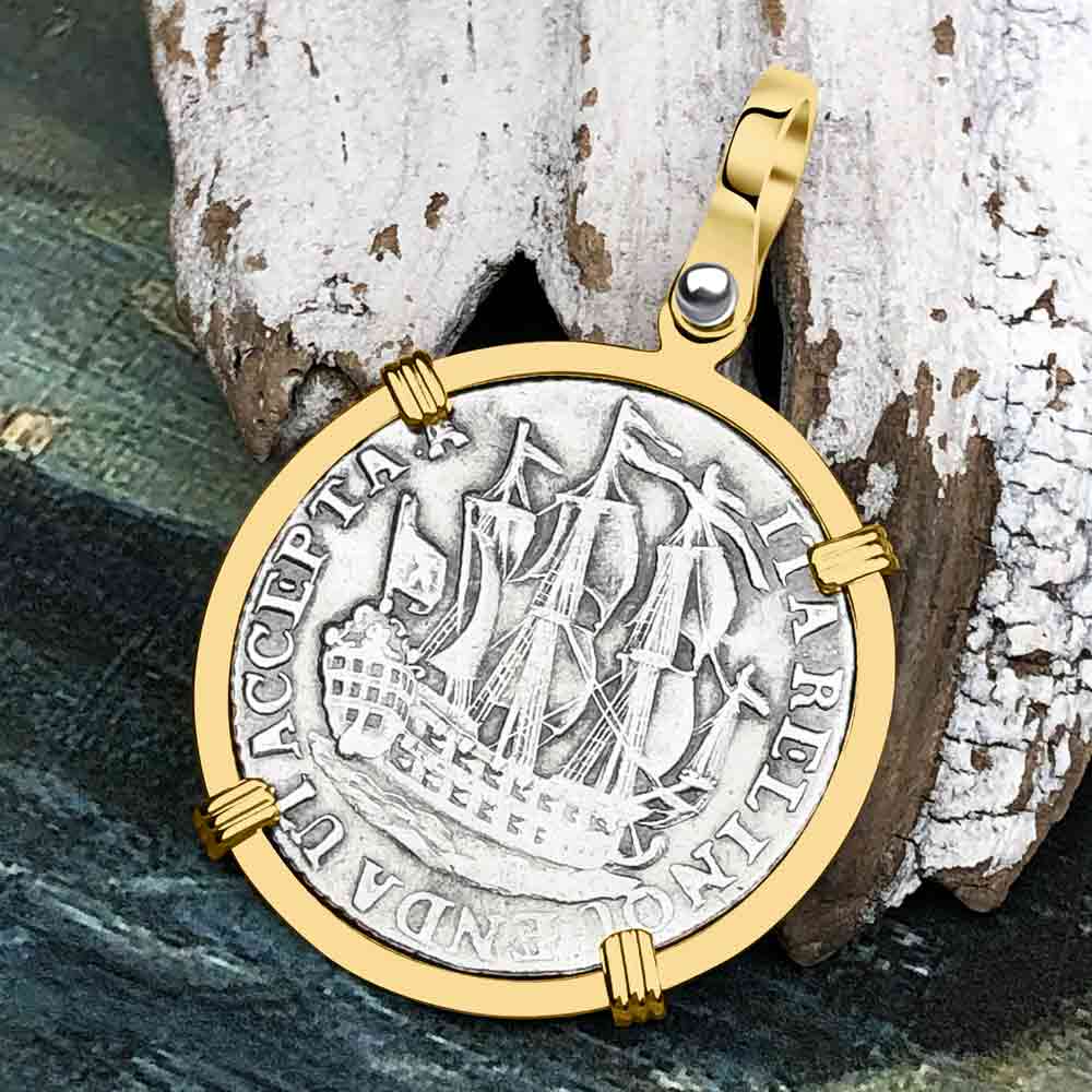 Dutch East India Company 1766 Silver 6 Stuiver Ship Shilling "I Struggle and Survive" 14K Gold Pendant | Artifact #5747 is backordered and will ship as soon as it is back in stock.