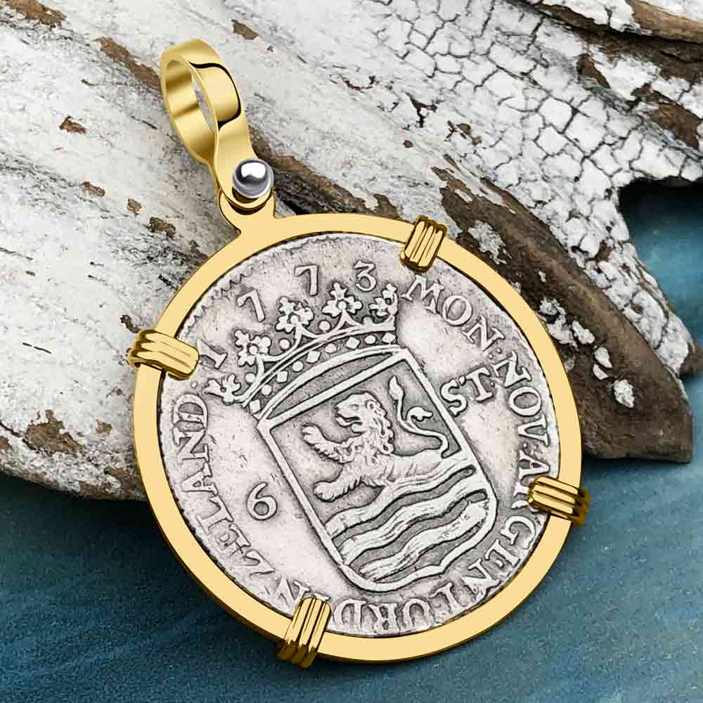 Dutch East India Company 1773 Silver 6 Stuiver Ship Shilling "I Struggle and Survive" 14K Gold Pendant | Artifact #5746