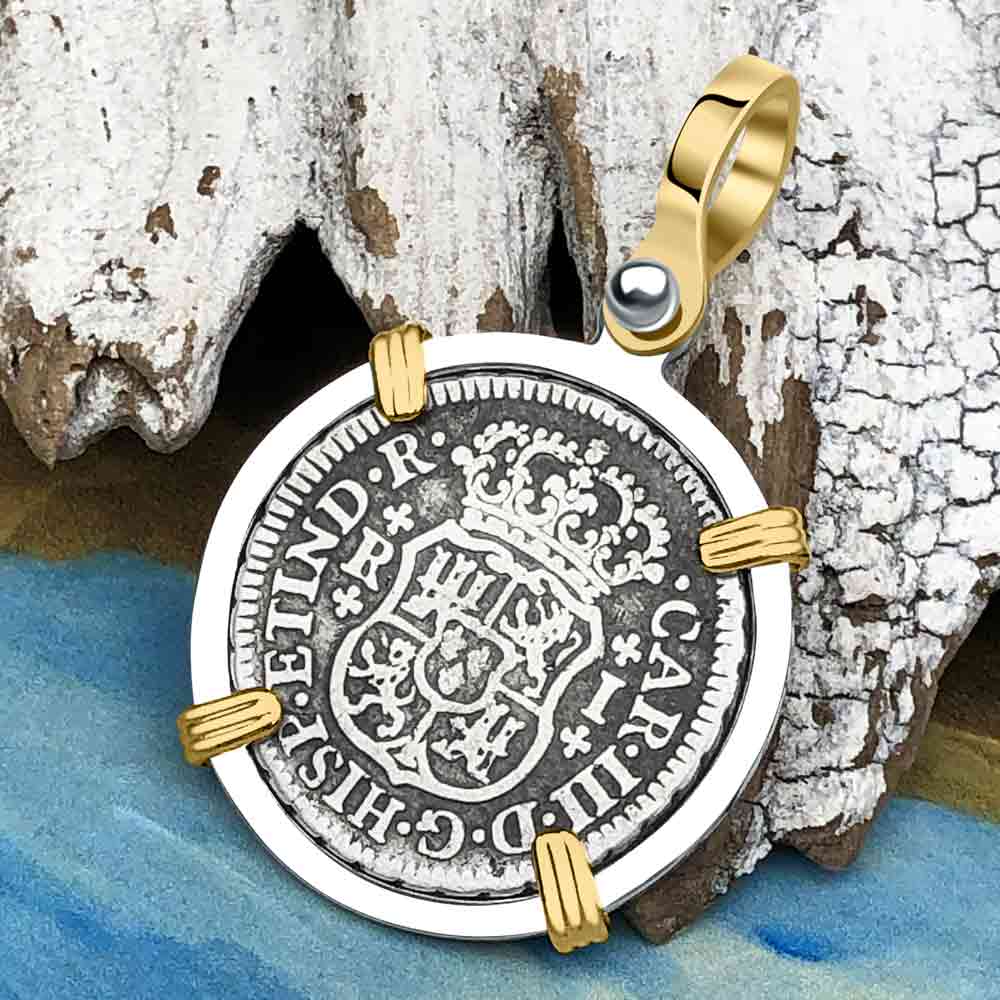 El Cazador Shipwreck 1763 RARE Pillar Dollar 1 Reale Piece of 8 14K Gold and Sterling Silver Pendant | Artifact #5228