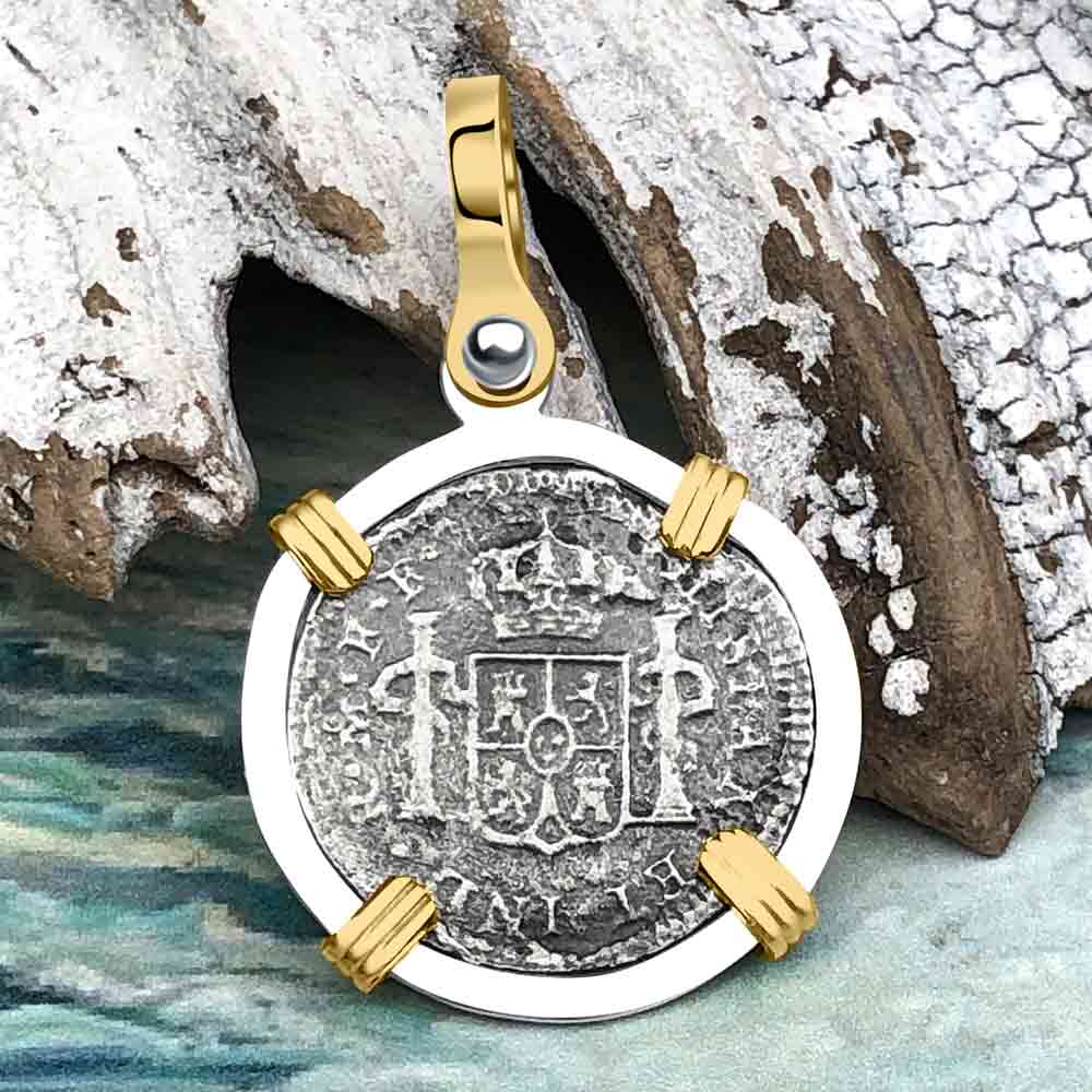 El Cazador Shipwreck 1783 1/2 Reale Piece of 8 14K Gold and Sterling Silver Pendant | Artifact #5205