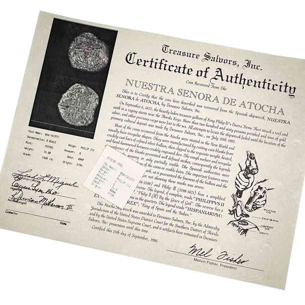 NOTES ON THIS ORIGINAL CERTIFICATE OF AUTHENTICITY: This coin comes with its original, historic Treasure Salvor's, Inc., raised seal Certificate and coin flip insert issued in 1986.