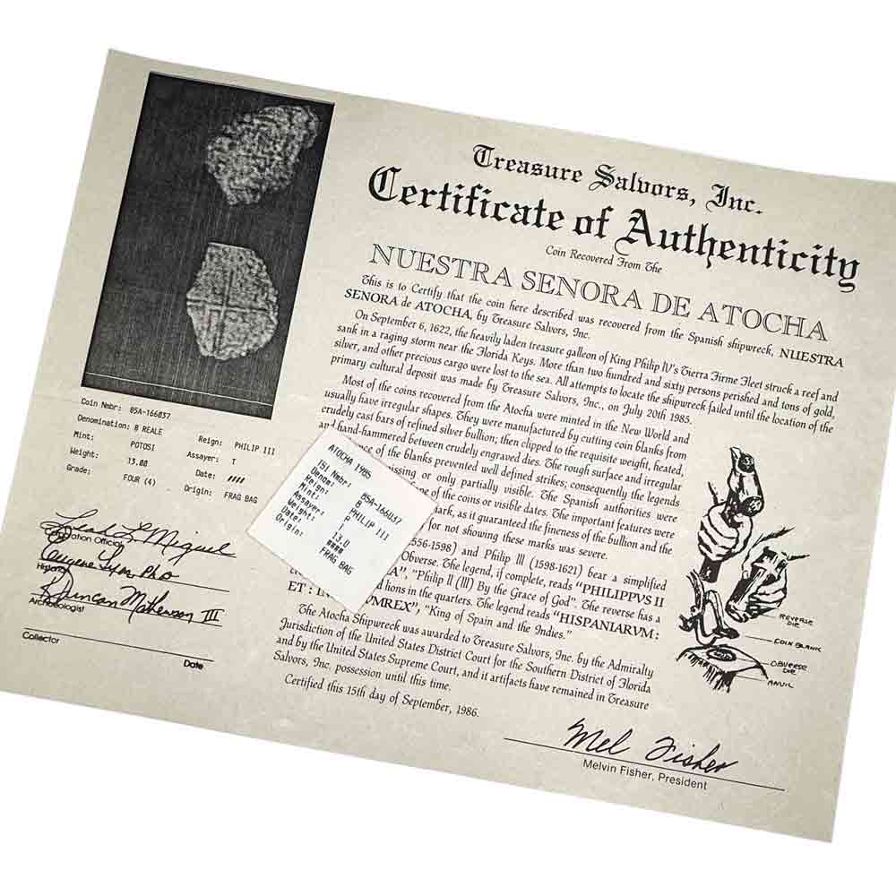 NOTES ON THIS ORIGINAL CERTIFICATE OF AUTHENTICITY: This coin comes with its original, historic Treasure Salvor's, Inc., raised seal Certificate and coin flip insert issued in 1986.