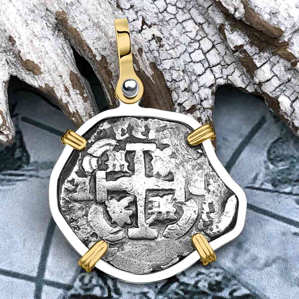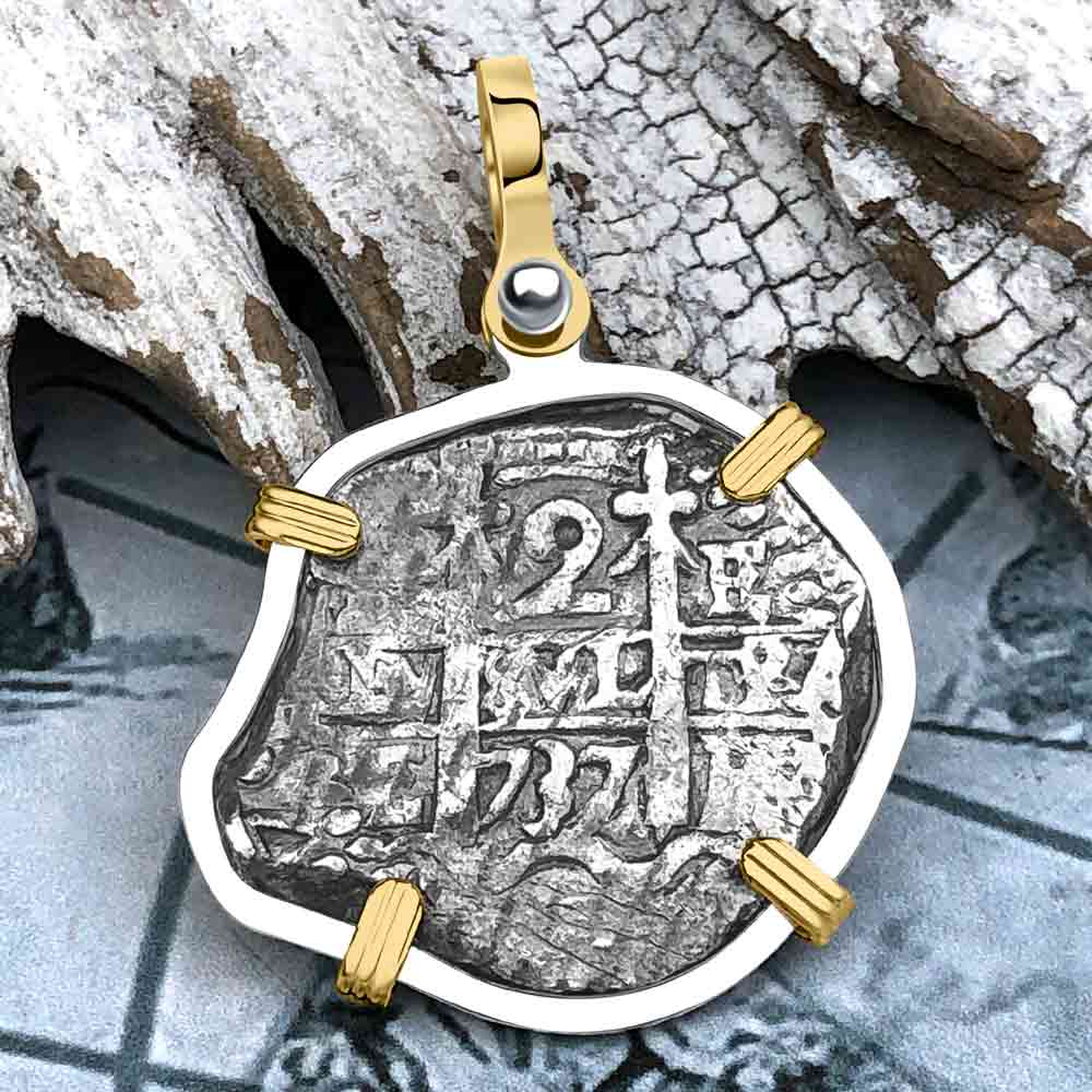 Pirate Era 1737 Spanish 2 Reale Piece of Eight 14K Gold & Sterling Silver Pendant | Artifact #5540 is backordered and will ship as soon as it is back in stock.