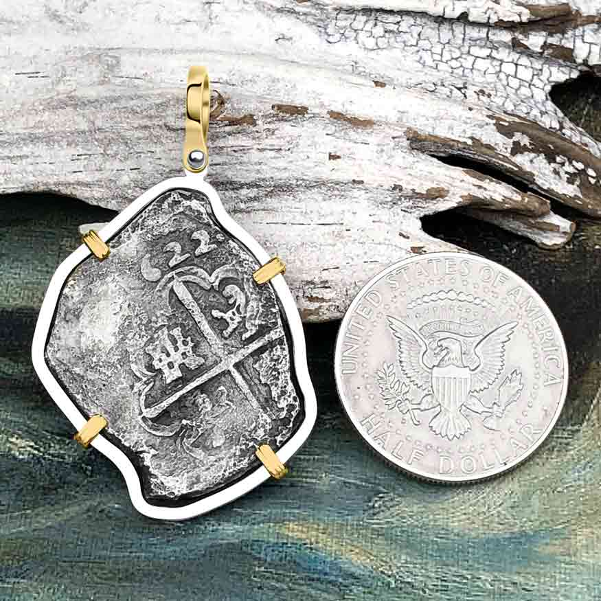 Rare Dated 1622 Sao Jose 8 Reale Pirate Era Shipwreck Coin 14K Gold & Sterling Silver Pendant | Artifact #5502 is backordered and will ship as soon as it is back in stock.