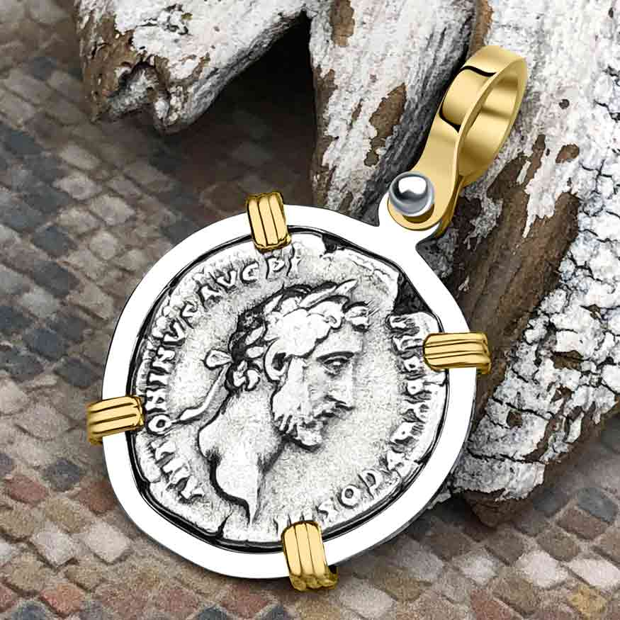Roman Empire Silver Denarius Coin of Antoninus Pius, the Protector 140 AD 14K Gold and Sterling Silver Pendant | Artifact #5472