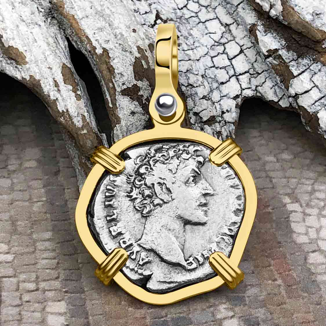 Roman Empire Silver Denarius Coin of Marcus Aurelius, the Philosopher Warrior 145 AD 14K Gold Pendant | Artifact #4065