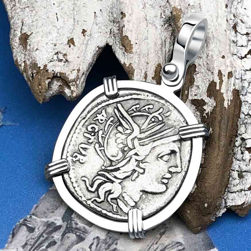 Roman Republic Silver Denarius 101 BC Roma & Jupiter 14K White Gold Pendant | Artifact #5413 is backordered and will ship as soon as it is back in stock.