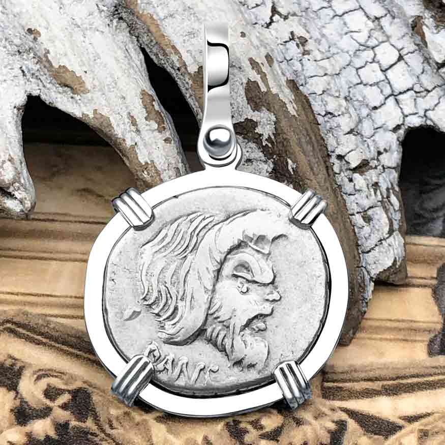 Roman Republic Silver Denarius 48 BC Pan and Jupiter 14K White Gold Pendant | Artifact #5415