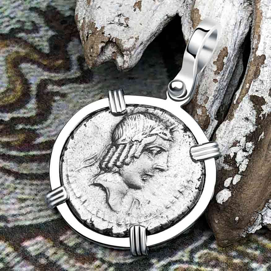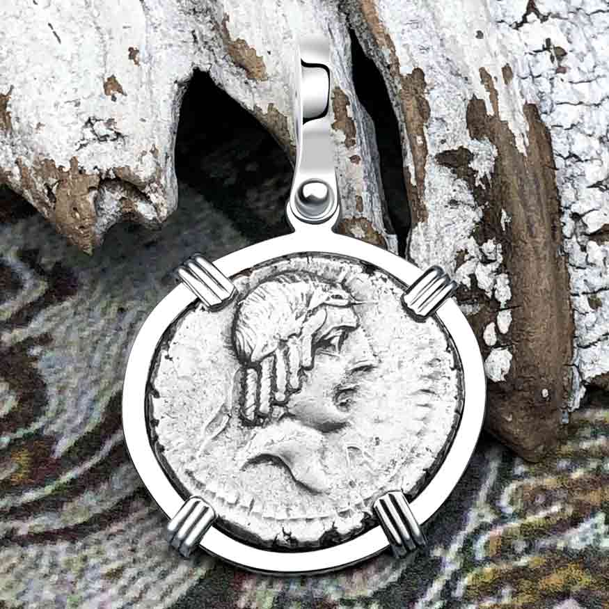 Roman Republic Silver Denarius 90 BC Apollo and the Horseman Coin 14K White Gold Pendant | Artifact #5408 is backordered and will ship as soon as it is back in stock.