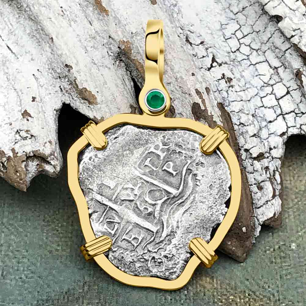 STUNNING Heart Shaped Pirate Era 1660 Spanish 1 Reale Cob Piece of 8 14K Gold with Emeralds Pendant | Artifact #3502 is backordered and will ship as soon as it is back in stock.