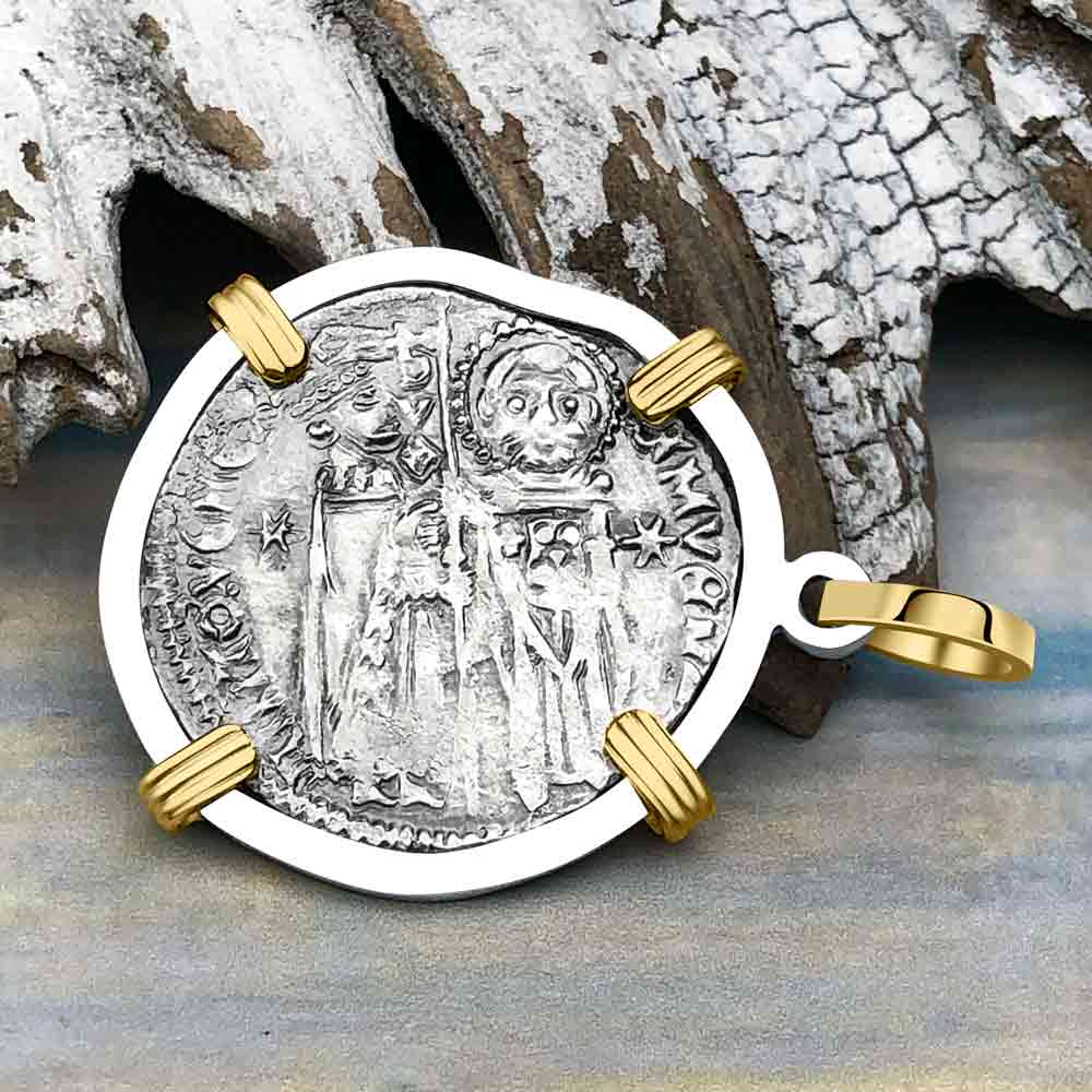 Venetian Jesus Christ Glory, Devotion & Courage Silver 1390 Grosso Coin 14K Gold and Sterling Silver Pendant | Artifact #5822