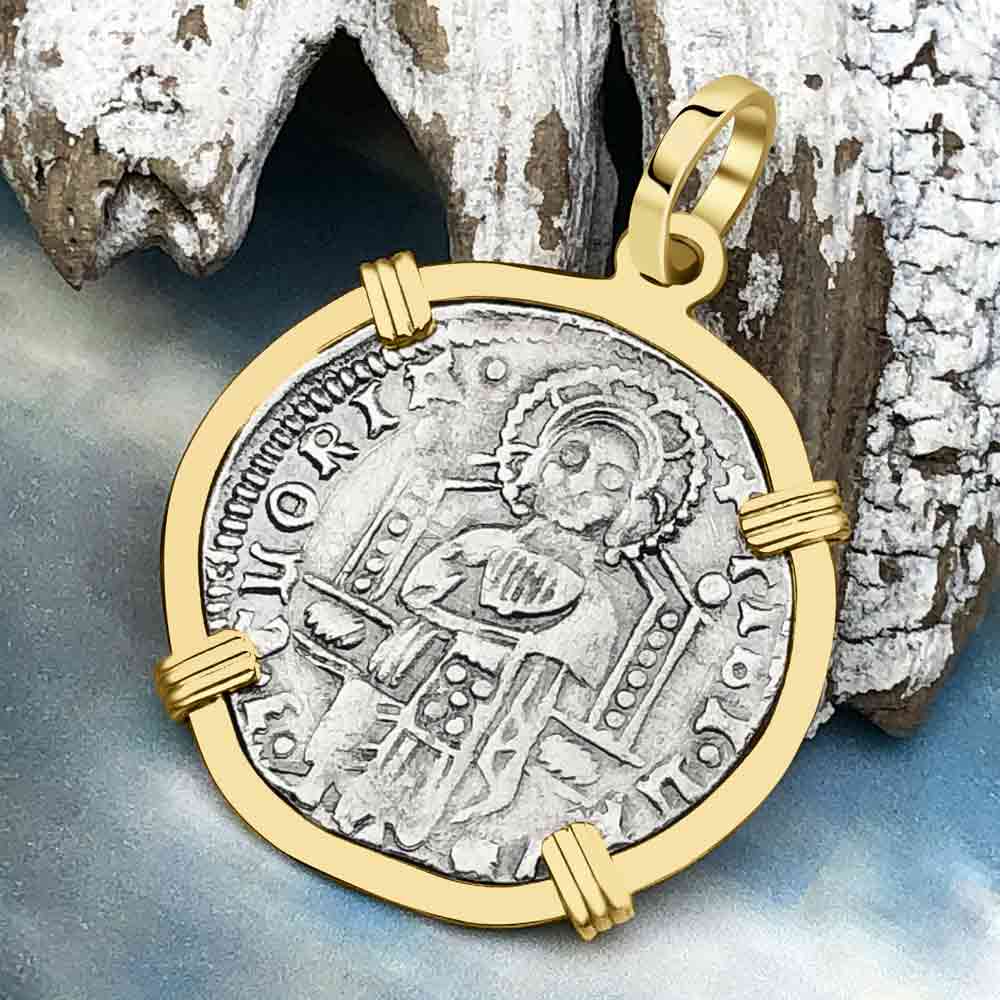 Venetian Jesus Christ Glory, Devotion & Courage Silver Zero-Die Axis 1390 Grosso Coin 14K Gold Pendant | Artifact #5820
